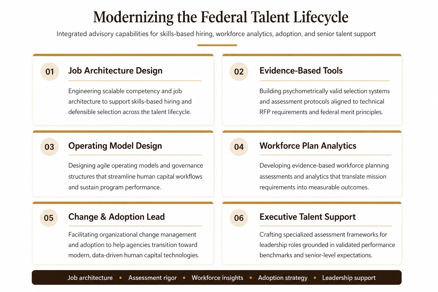 We are the human capital and assessment strategy layer that ensures technology solutions are grounded in sound I/O principles and scalable federal entities.